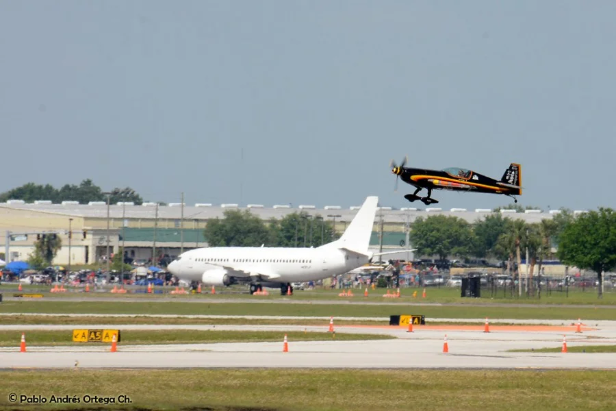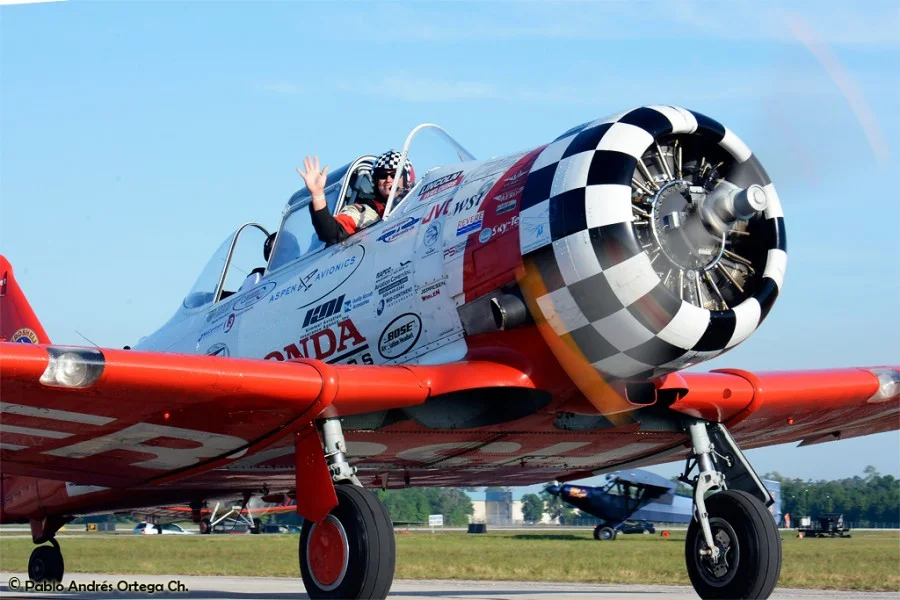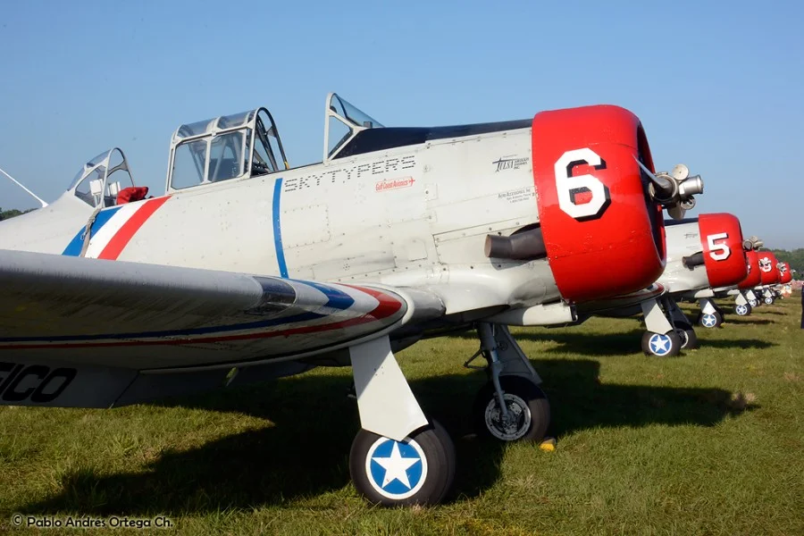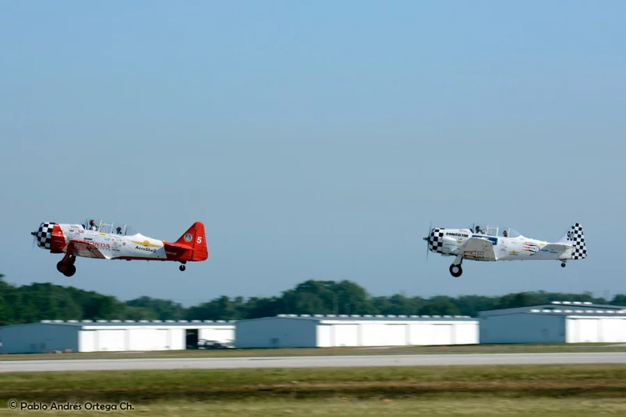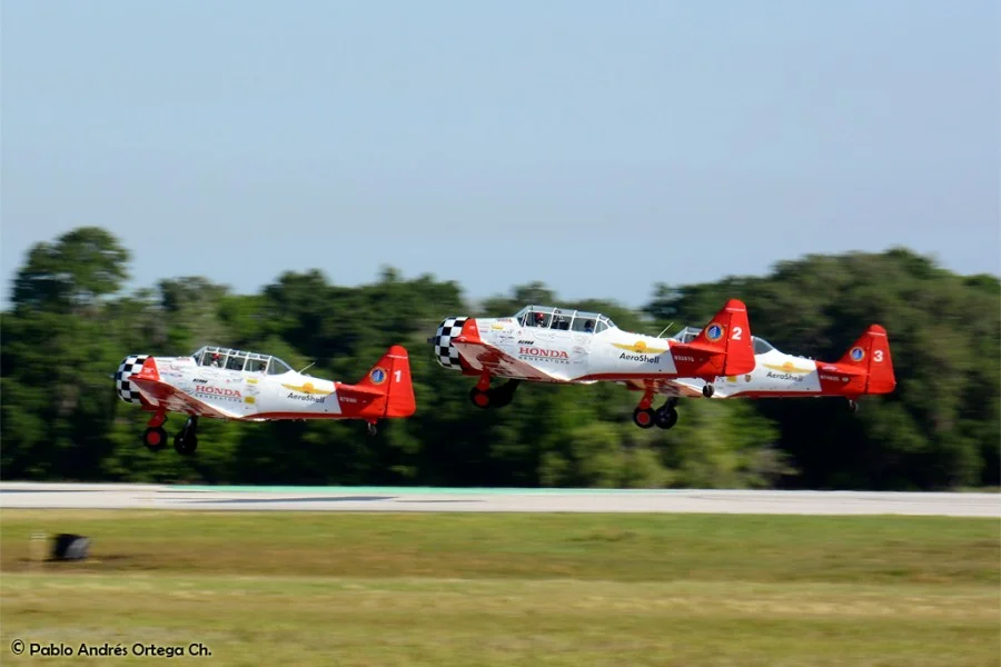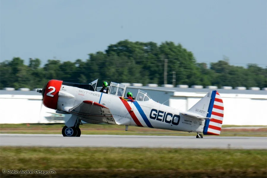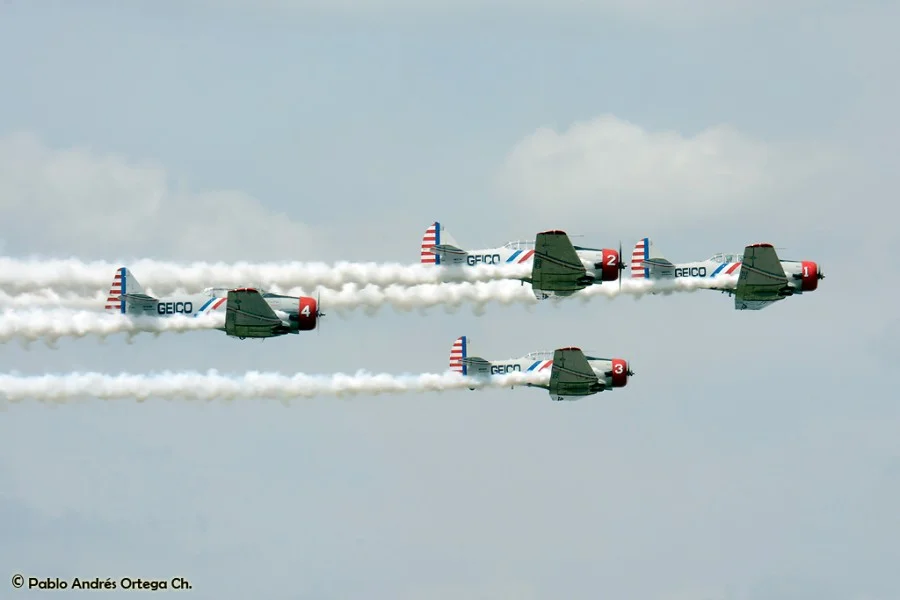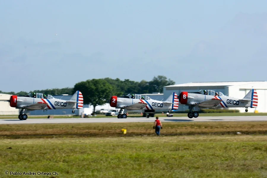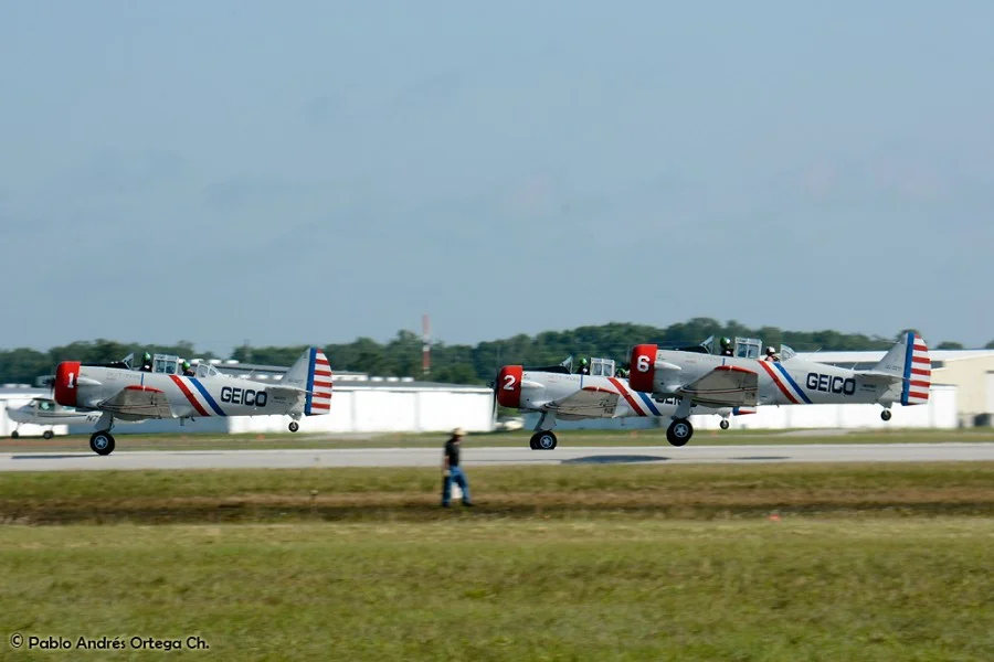 Los GEICO Skytypers también hicieron lo suyo escribiendo en el cielo y volando en formación. Fuimos invitados a volar con ellos durante una de sus presentaciones, en las que pudimos disfrutar del espectáculo desde otra perspectiva. Adicionalmente hubo sesiones de acrobacia diversa de las cuales se destacan las presentaciones de David Martin a bordo de un CAP-232 de Breitling, un Beech 18 bastante aguerrido y Patty Wagstaff, la primera dama de la acrobacia, en su Extra 300S de fabricación alemana.